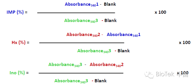 加好样的96孔板送入BioTek具备吸收光检测的仪器中读取340nm的吸收光即可完成测定(例如Epoch及Epoch2),后续通过以下的运算公式,可以定量APT的三种代谢产物的百分比含量,而这个步骤,也可以通过Gen5的数据处理记忆模块自动完成: