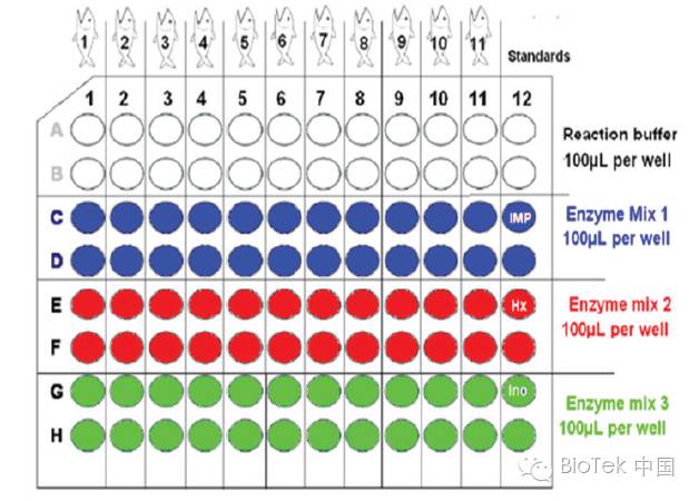 96孔板布板图,每块96孔板可检测11种水产样品,按照图示区域添加酶混合物即可。