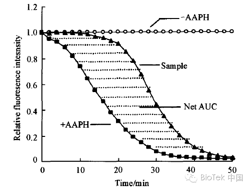 抗氧化剂作用下的荧光衰退曲线下面积与无抗氧化剂存在时自由基作用的荧光衰退曲线下面积之差,即荧光熄灭曲线的延迟部分面积Net AUC为抗氧化剂的保护面积(图中斜线面积)。