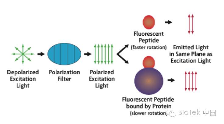 荧光偏振是Perrin于1926年最初提出的一种荧光检测技术。主要是观察溶中的荧光分子,偏振光激发时,将发射偏振光,由于荧光分子的旋转,发射光的水平光强和激发光的水平光强将会不同。荧光信号的偏振和分子旋转速度相关,旋转速度又受溶液的粘度、绝对温度、分子体积和气体常数影响。如果保持粘度、温度恒定,那么旋转速度的变化主要取决于分子体积和分子重量。